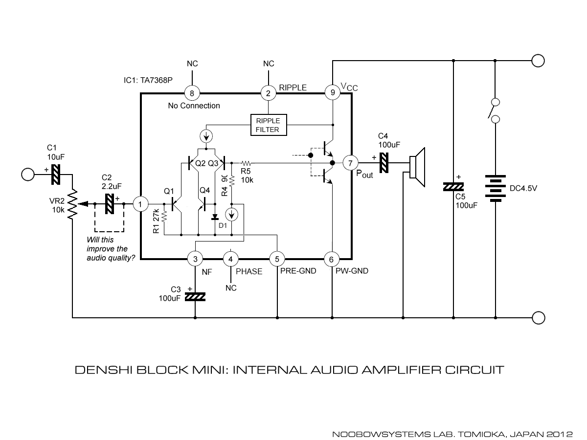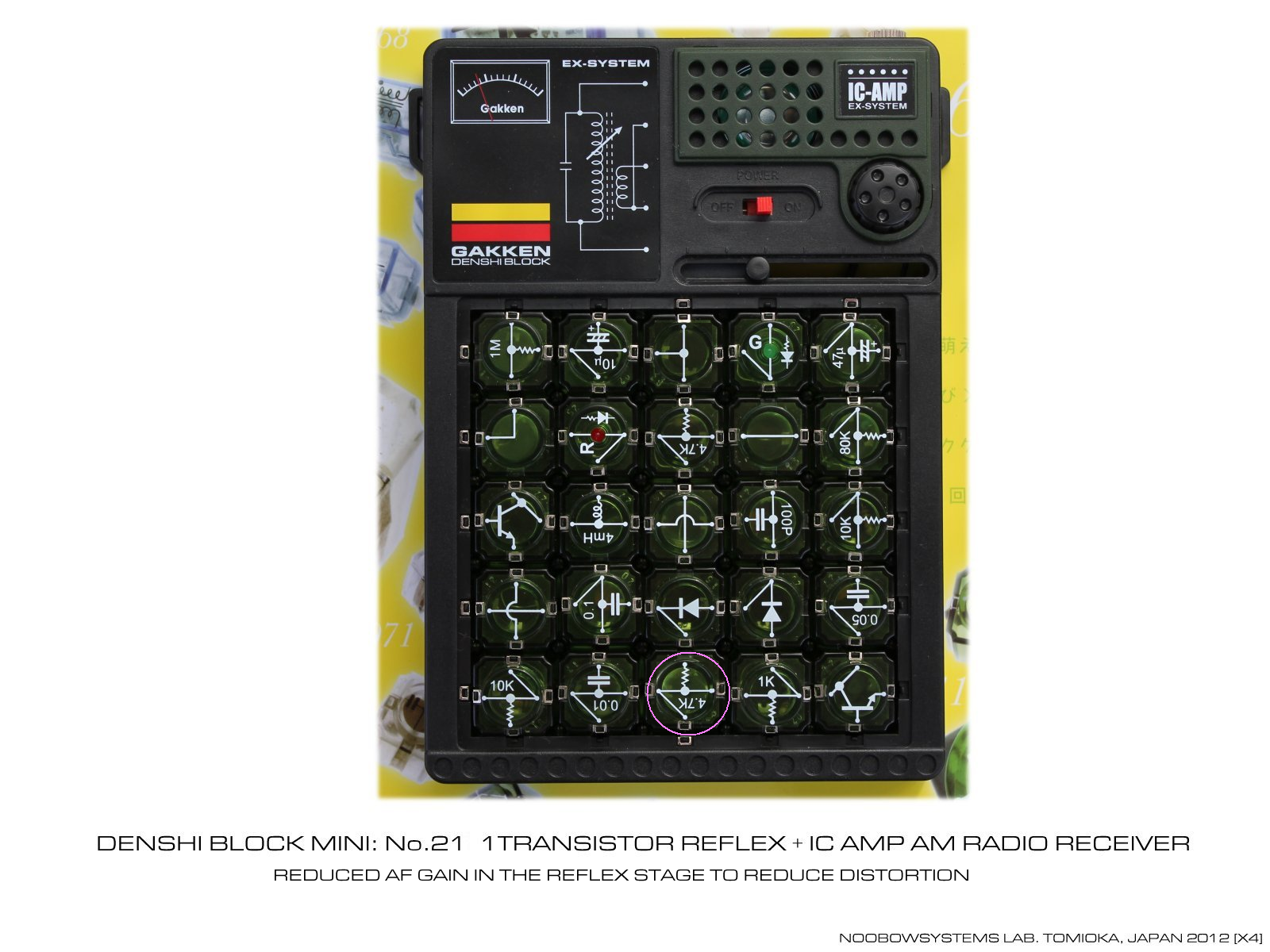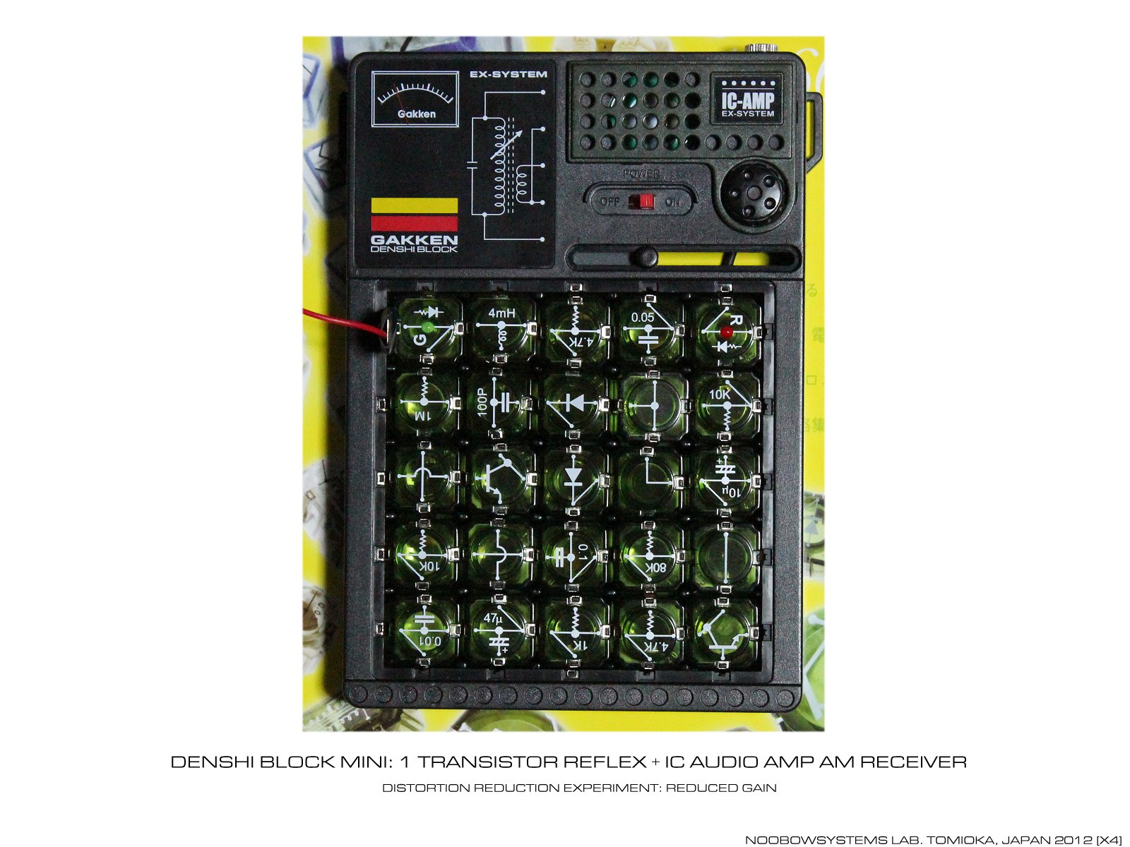 で、つぎに、 電子ブロックmini No. 20 高周波1石 + ICアンプラジオ を組み立ててみました。 同調回路からの信号をトランジスタ1石で高周波増幅し、コレクタからの出力をダイオードで検波し、 その低周波信号を本体内蔵のICアンプで増幅しスピーカを鳴らしています。 送信アンテナから約50km離れた第3研究所では、2mの室内ワイヤーアンテナとアース(室内機器のグラウンドラインに接続) が必要。 NHKをはじめ民放数局が聞こえます。 選択度はこの方式ならまあまあ。AM放送帯上半分では分離はやはり不足です。 感度と分離はこんなものという感じなのですが、音がかなり歪っぽくて悪く、 とても番組を楽しむようなものではありません。 なんでだろう、とても簡単な回路なのに。 ひょっとして本体内蔵アンプあるいは本体内蔵スピーカのせいかと思い、外部音源で本体アンプ・スピーカを鳴らしてみると、 さすがに音量を上げるとスピーカがビビりはじめてしまいますが、今回のラジオの音の悪さを説明できません。 回路図を見てみると、本体内蔵アンプについている音量調整用のポテンショメータ(ボリューム)は10kΩ品が使われているとのこと。 おや、10kΩVRってこの回路にしては小さすぎないかなあ。 電子ブロックminiの本体内蔵アンプにつないでいるブロックを抜いて、 ダイオード検波出力を EL500でつくったトランジスタオーディオプリブースター にいれ、予備増幅した後に 山水AU-7700 のプリアンプと LM386貧乏アンプ でJBL 4305Hを鳴らしてみると、似たような音質。やはり歪っぽいです。 このEL500プリ ブースター アンプには、 Toshiba X01T をつないだときに ジャックセンシング が効くように入力に10kΩシャントを入れてありましたが、 これを取り外してみると・・・おおおっ!! 音ががぜん大きくなり、さらに歪が大幅に減った!! パーフェクトというには歪も残っているしノイズも多いけれど、これならゆっくり番組を楽しめる。 やはり、本体内蔵アンプのボリュームの10kΩがダイオード検波回路にとっては重すぎる負荷だったのです。 ひずみは減りましたが受信音は低音がまだ細く、またノイズも多いです。 同調コイル2次側の直流阻止キャパシタを0.1μFブロックから0.05μFブロックに変え、 ダイオード検波出力の平滑キャパシタを0.01μFブロックから0.1μFブロックに置き換えたら、 ノイズがぐっと減り、低域が豊かな音質になりました。 これならリラックスしてずっと聴いていられる。 電子ブロックminiで受信していることを忘れてしまいそう。 このラジオの性能がよくないのはもうひとつ、 スピーカから出る音声信号波形に合わせて高周波増幅トランジスタの電源電圧が変動し、 それがそのまま検波出力信号に影響してしまうのです。 結果として、アンプのボリュームを上げるなどして大きな音が出ると、 フィードバックが発生してしまい、ひどいとモーターポーティングや異常発振を引き起こしてしまうのです。 これは電源ラインのデカップリングが不足していると言われる状態です。 対策としては、高周波トランジスタへの電源ラインに抵抗と大き目のキャパシタを入れてあげればOK。 簡単なことですが、ブロック式配線では思いついた回路にブロックを並べるのは、 できたとしてもとても大変です。 2012-01-30 Circuit No.20 1RF + IC AM Radio Receiver |