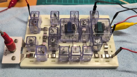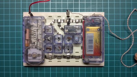 スピーカが付属していないSR2Aで試せるものになっています。 マイキット80には高周波チョークコイルはなく、 レフレックス回路はつくれませんでした。 ゲルマニウムダイオードも1本しかなかったので倍電圧検波もできず。 レフレックスが作れる、という点で電子ブロックの勝ちですね。 うまくブロックをレイアウトできればマイキットよりも配線長が短くなり、 ラジオの動作も安定します。 |