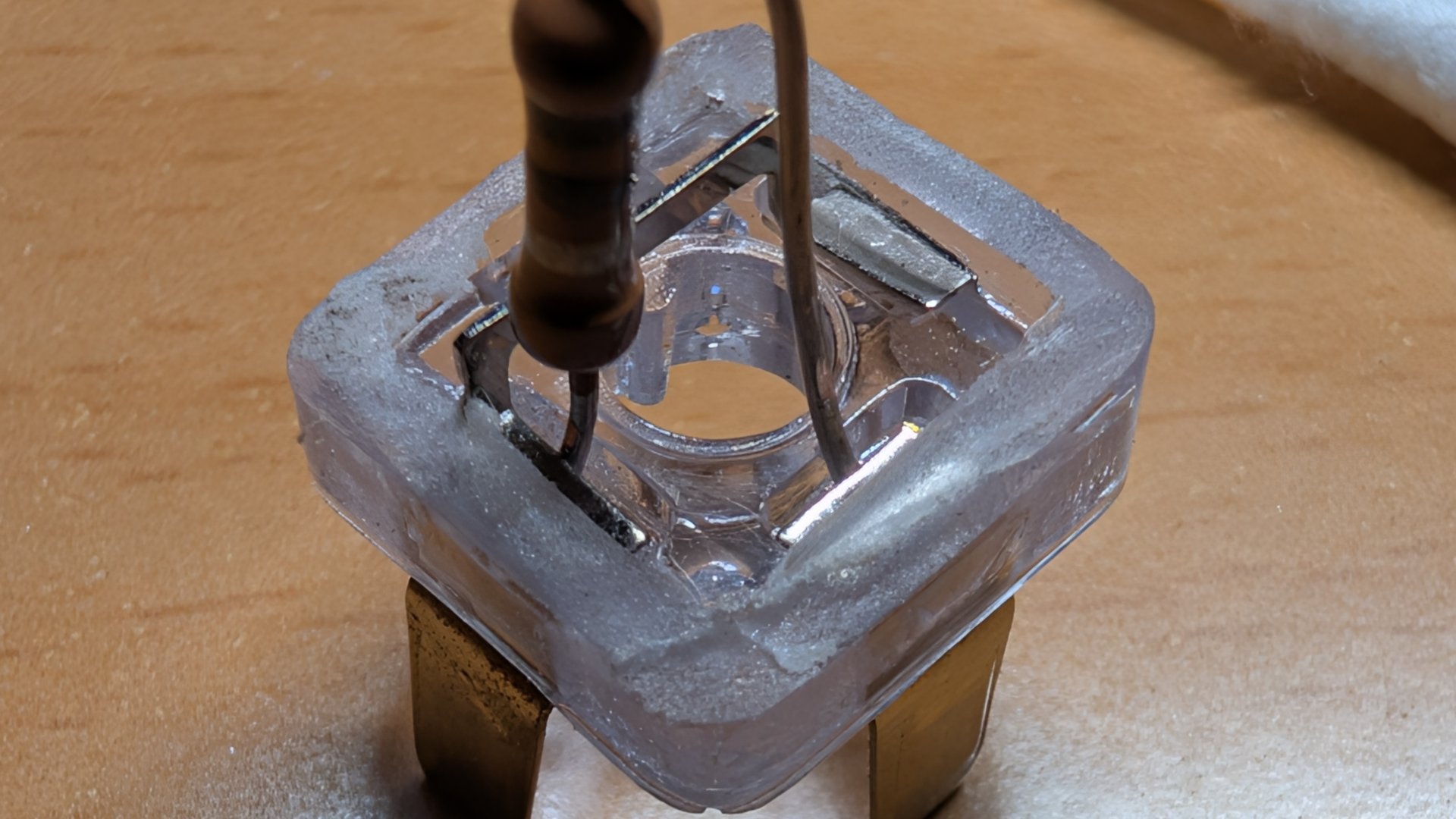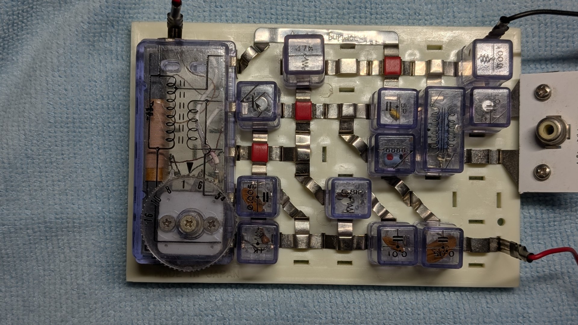しばらくあちこちチェックしたりブロックをグネグネゆすってみたり。 ブロックのターミナルピン表面にはサビはなくかなりいい状態を保っていますが、 それでも接触不良は出ているようで、 ブロックのピンを接点ブライトで処理したり磨いてみたり。 じきにラジオが鳴りはじめました。 さすがレフレックス! 微弱電界地域の富岡ですが、 アンテナ線をつながずによく聞こえます。 マニュアルにはトランジスタのベース抵抗を4通りに変える方法が記載されています。 本機とラボの環境ではベース抵抗を低くすると発振気味になりましたので、 ベース抵抗は1MΩ+250kΩに設定しました。 |