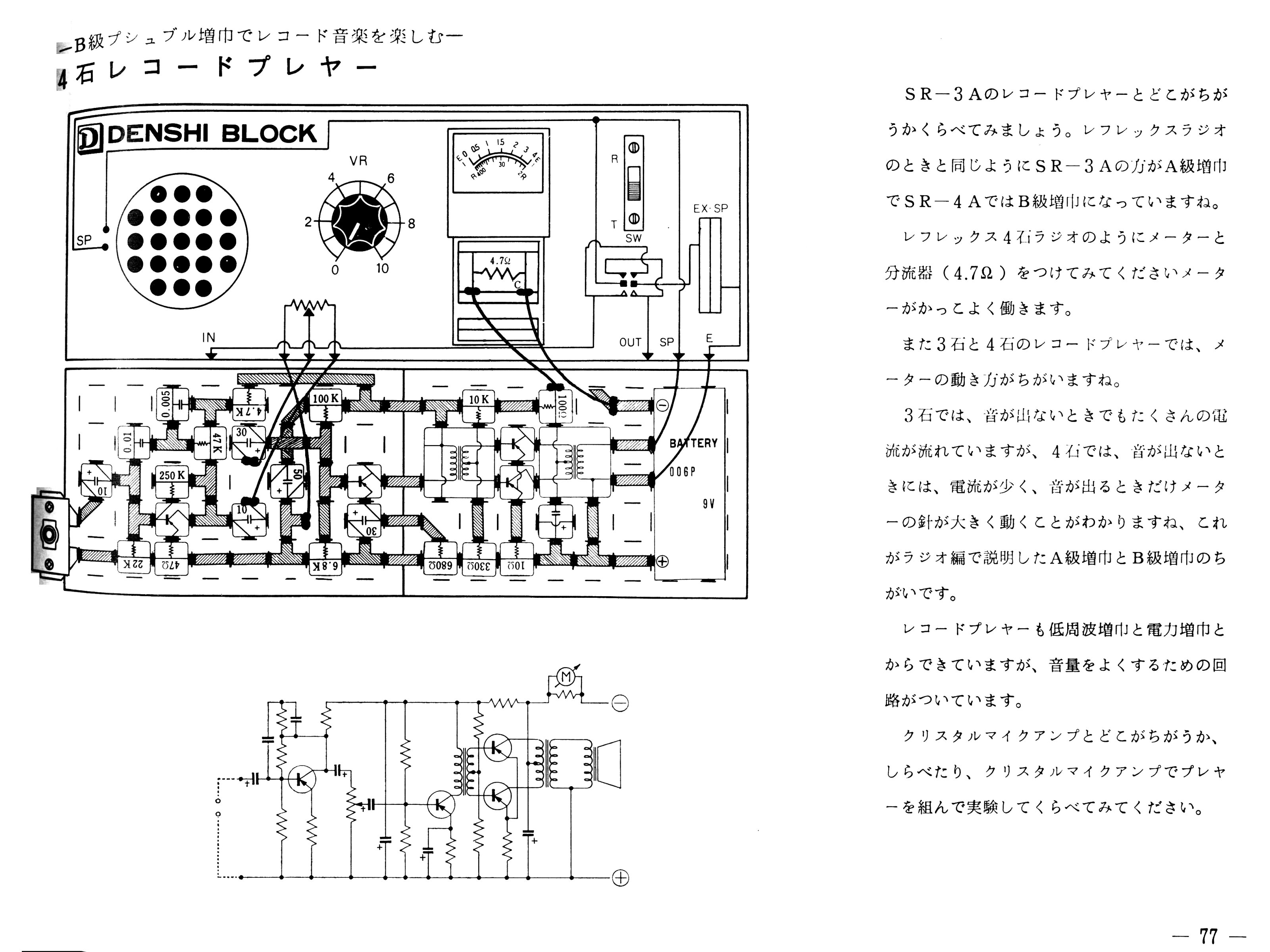 プッシュプルが使えれば付属のスピーカが負けるほどのパワーが出せます。 プッシュプルアンプを作ろうとするとドライバ含めトランジスタは3石必要。 けれどもSR3Aではトランジスタは3つしか付属していないため、 プリアンプ用のトランジスタがありません。 だからプッシュプル式のレコードプレーヤアンプを作るのは無理。 プッシュプルB級を使う実験は、 ドライバトランジスタを発振させてブザーにするといった使い方のものがいくつかあるだけ。 トランジスタが4つあるSR4Aなら、 プッシュプル式のレコードプレーヤアンプが作れます。 右図がそれ。 マニュアルでは説明されていないものの、 初段のプリアンプにはしっかりRIAAイコライザが入っています。 SR4Aでは1石レフレックス+1石ドライバ+2石プッシュプル構成の4石レフレックスラジオが作れます。 微弱電界地域でも大きな音で番組を楽しめたでしょう。 |