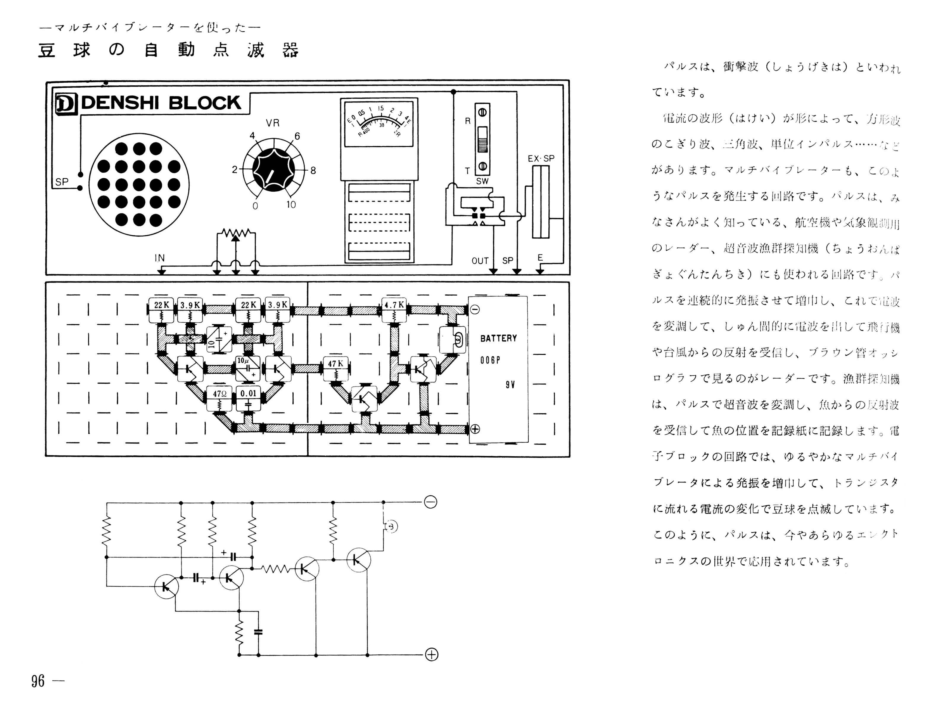 定番の非安定マルチバイブレータをつくりましょう。 と、あれれ? SR3Aのマニュアルにはマルチバイブレータ回路はひとつも出てきません。 SR4Aではアステーブル / モノステーブル / バイステーブルのマルチバイブレータが出てきます。 マニュアルの回路図はブロックの並びに近くなるように描かれているので、 トランジスタ2つが向かい合ったマルチバイブレータに特徴的な配置になっておらず、 一瞬戸惑ってしまいますが。 SR4Aのマルチバイブレータ回路では電圧ステートをトランジスタ2石で増幅してランプを点滅させています。 マニュアルではモノステーブル / バイステーブルのことが「モノステアブル」「バイステアブル」と書かれています。 昭和のころはこんな感じで英語の表記が間違っている書籍が多かったですね。 |