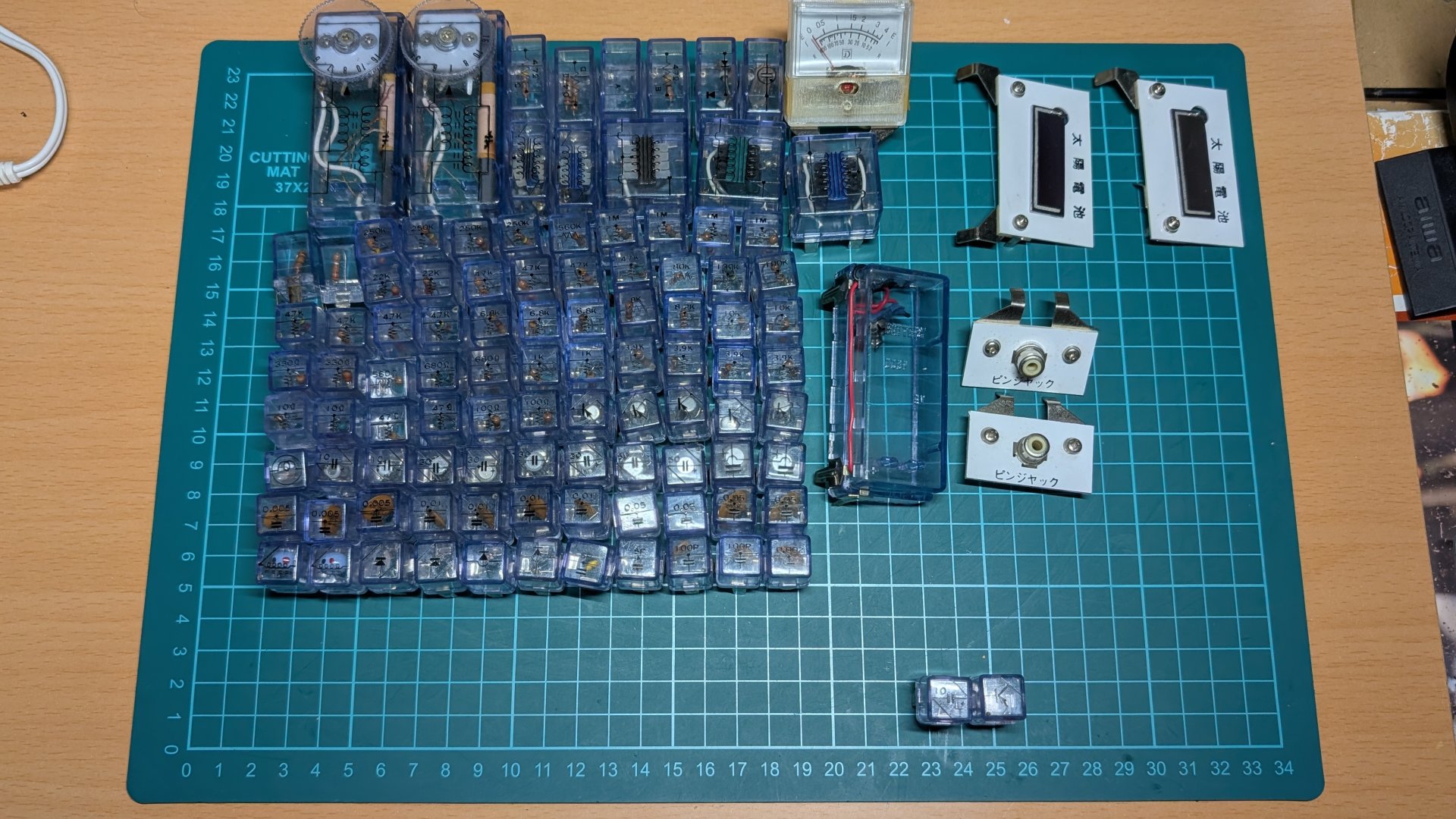 当時物のクリスタルイヤホンはロッシェル塩が風化してダメになってしまうものだと聞いていましたから。 太陽電池は2個とも、室内の明るさで0.5V以上を出しています。 スピーカもOK。 |