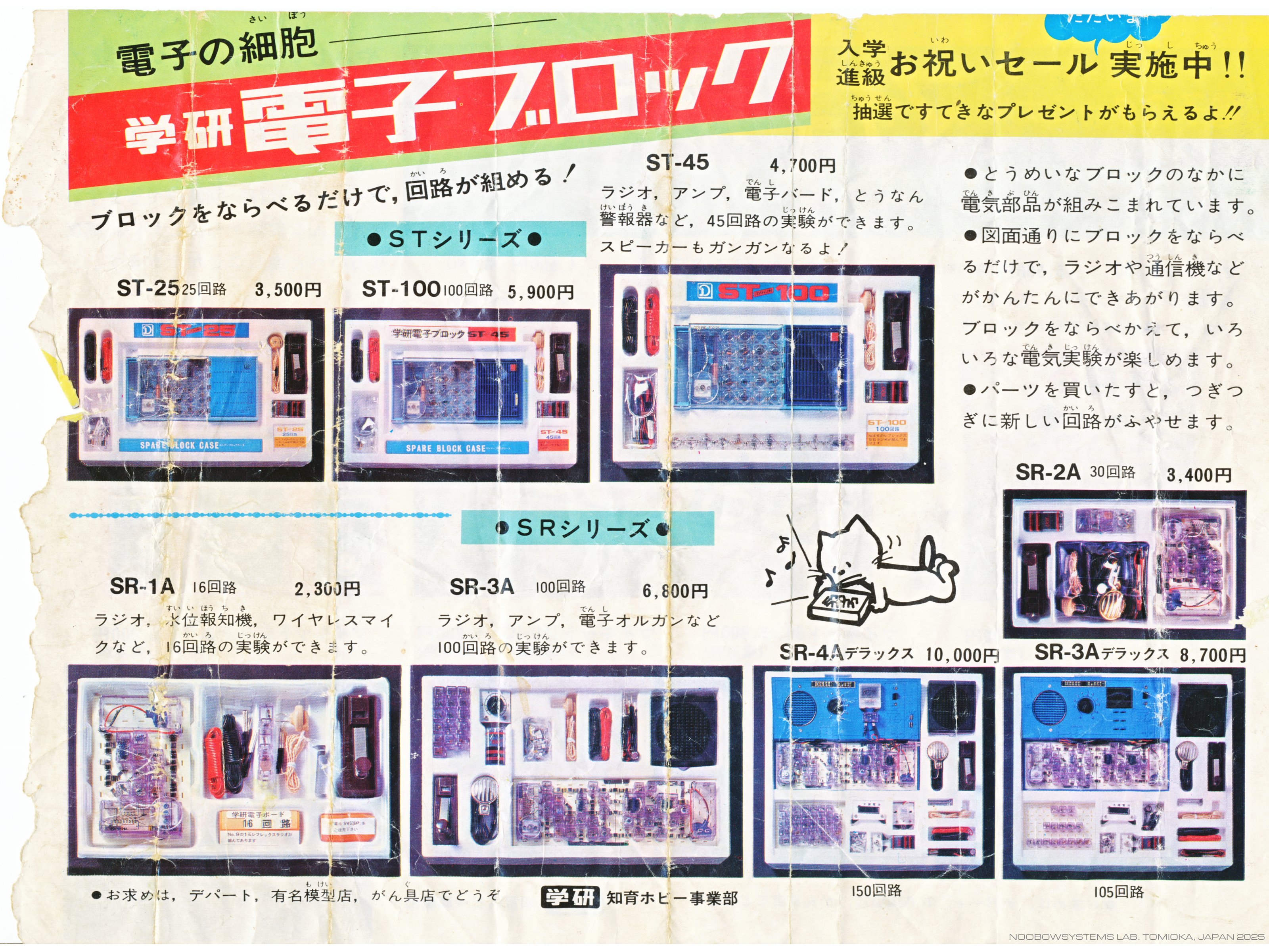 さらにその前が今回手に入れた電子ブロック 「電子ボード」SRシリーズだったんですね。 今回手に入れたパッケージにはSR3A Deluxeと書かれています。 定価8700円。 もし当時の自分がマイキットではなくて電子ブロックを欲しがったとしても、 とても買ってもらえるものではなかったでしょうね。 |