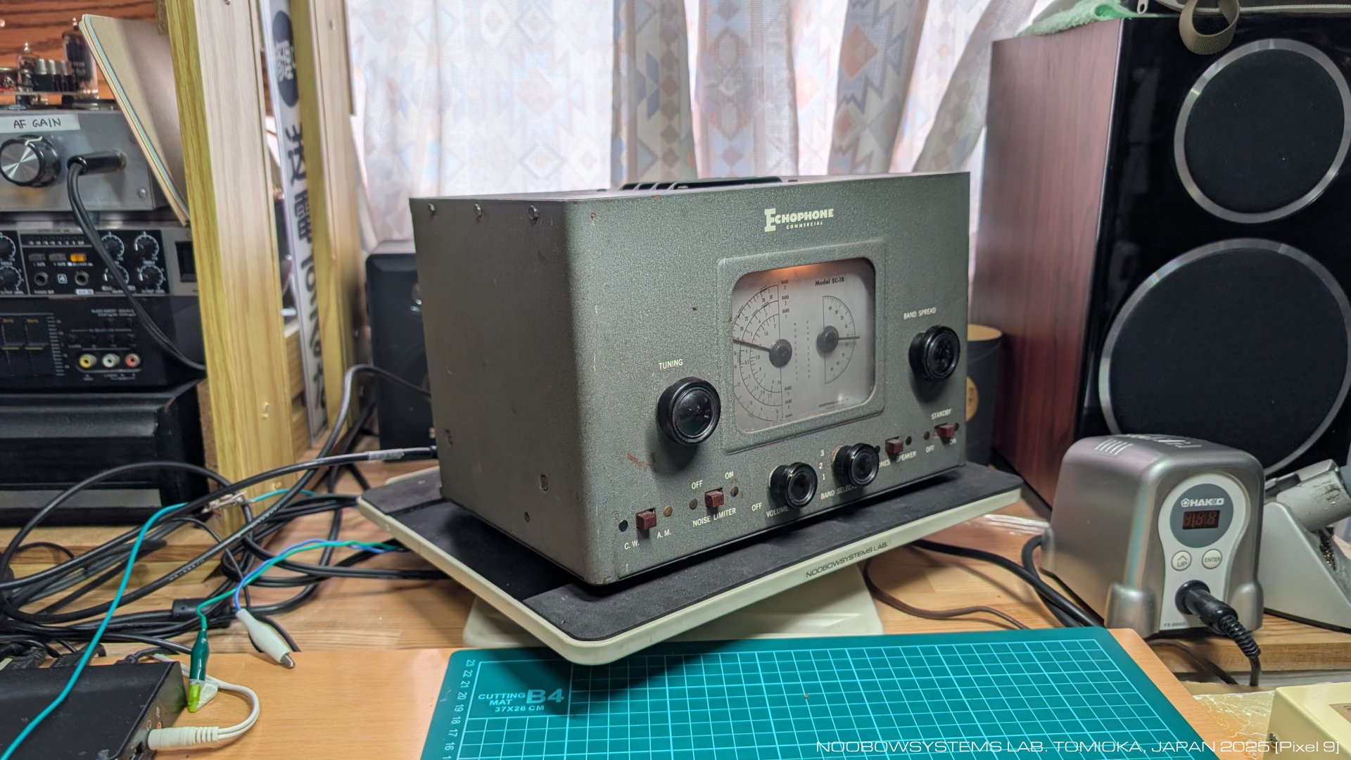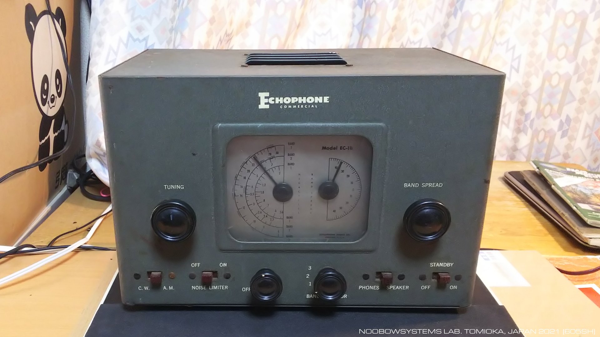 最後に電源を入れたからはや23年が経過しています。 永い眠りから目を覚ましたEC-1Bがさいしょに受信したのはJOAK NHK東京第一、 第2回目の緊急事態を宣言する総理のスピーチが流れてきました。 いつまで続くんでしょう、 そしてこの先どうなってしまうんでしょうか。 1998年にすでに出ていたチューニング時のスクラッチノイズは、 バリコンシャフトに接点洗浄スプレーを吹いてほぼ消えました。 あわせボリュームワイパーにも接点洗浄スプレーを吹いて、 EC-1Bはほぼ完調になりました。 チューニングのバックラッシュはなく、 バンドスプレッドもスムース。 選択度も良好。 新型ペンタグリッドコンバータ12SA7を使ったスーパーヘテロダインはドリフトがほとんどなく、 ゆっくり短波を楽しめます。 どうやらこのラジオは、 すくなくとも今の状態ならほぼ整備不要と見えます。 ふたたび段ボール箱にもどし、 点検作業は完了。 2021-01-07 動作チェック |