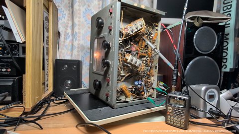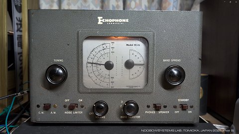 そうではなくてこの受信機はイメージとゴーストがかなり酷いようです。 これはおそらく、実際に観察はしていないのですが、 局発の波形が歪んでいて高調波や低調波が含まれているのでしょうね。 ほとんど同じ設計のEC-1AやS-41Gに比べてもこの傾向は目立つので、 局発周りの点検をしたら異常が見つかるのかもしれません。 いまのところこのEC-1Bは「当時物のコンポーネントで動作している」のが見どころと勝手に思っているので深くは追及せず、 次の輪廻の課題にとっておきましょう。 |