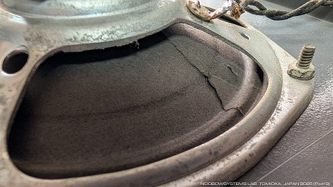 今回もこのまま作業完了にしましょう。 スピーカはコーン紙が破れかかっています。 このキャビネット相応の音で鳴ってくれていますが、 ゆっくり番組を楽しむにはやはり良質な外部スピーカを使いたいところ。 |