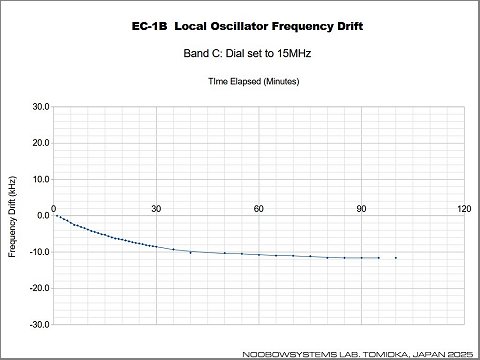 室温は18℃スタート。結果は右図。 電源投入後45分程度で周波数変化は落ち着き、 国際ラジオ放送を聞くならじゅうぶんな安定度になります。 ファクシミリを受信するなら1時間15分程度のウォームアップはほしいところで、 そのあとは室温変化と電源電圧の影響の変動になります。 2025-12-14 局発周波数ドリフト測定 |