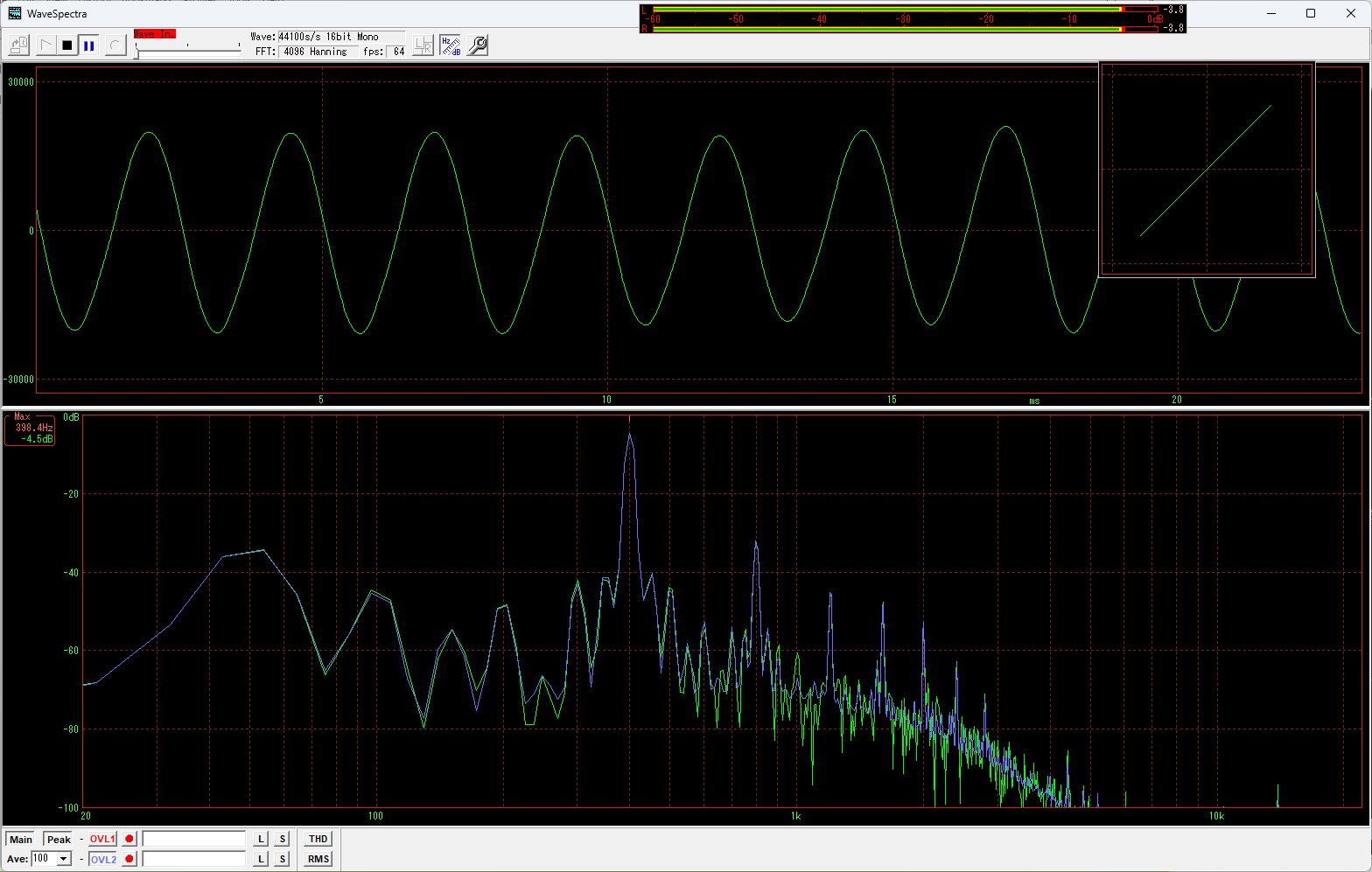 シグナルジェネレータで400Hz 100%で変調した信号を作って受信させスピーカ出力の波形を見てみるときれいな波形。