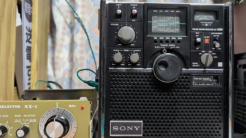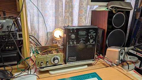 リキャップした方がいいのかもしれません。 5800の電解キャパシタでFMのときだけ使われるのは、レシオ検波のC78 10uFだけ。 まずは狙いをつけてこれを交換してみようか。 あとはFM局発の電源電圧フィルタ C4 100uFの可能性もありますね。 これが完全に容量抜けになれば、 スピーカの音声出力波形に応じてわずかにFM局発のコレクタ電圧が変動し、 局発周波数が変動して、結果としてFM中間周波にさらに自分でFMをかけてしまう形となってしまうはずです。 2026-01-17 でもちょっと待って、 いままではイヤホンジャックから音声信号を取り出して外部アンプとスピーカで聴いていたけれど、 REC OUTから取り出した場合は普通の音質だぞ? これはオーディオアンプ部で音質劣化が起きているのかも。 右の動画はREC OUT取り出しで外部パワーアンプ&ブックシェルフスピーカ使用。 ミズホSX-1でイメージ周波数側のノイズも低減できていて、いい音で鳴っています。 さらに、外部アンプにつなぐときはREC OUT端子よりもMPX OUTから検波出力を取り出すのがさらに好都合ですね。 これは ICF-1100D も同じ。 2026-01-18 |
