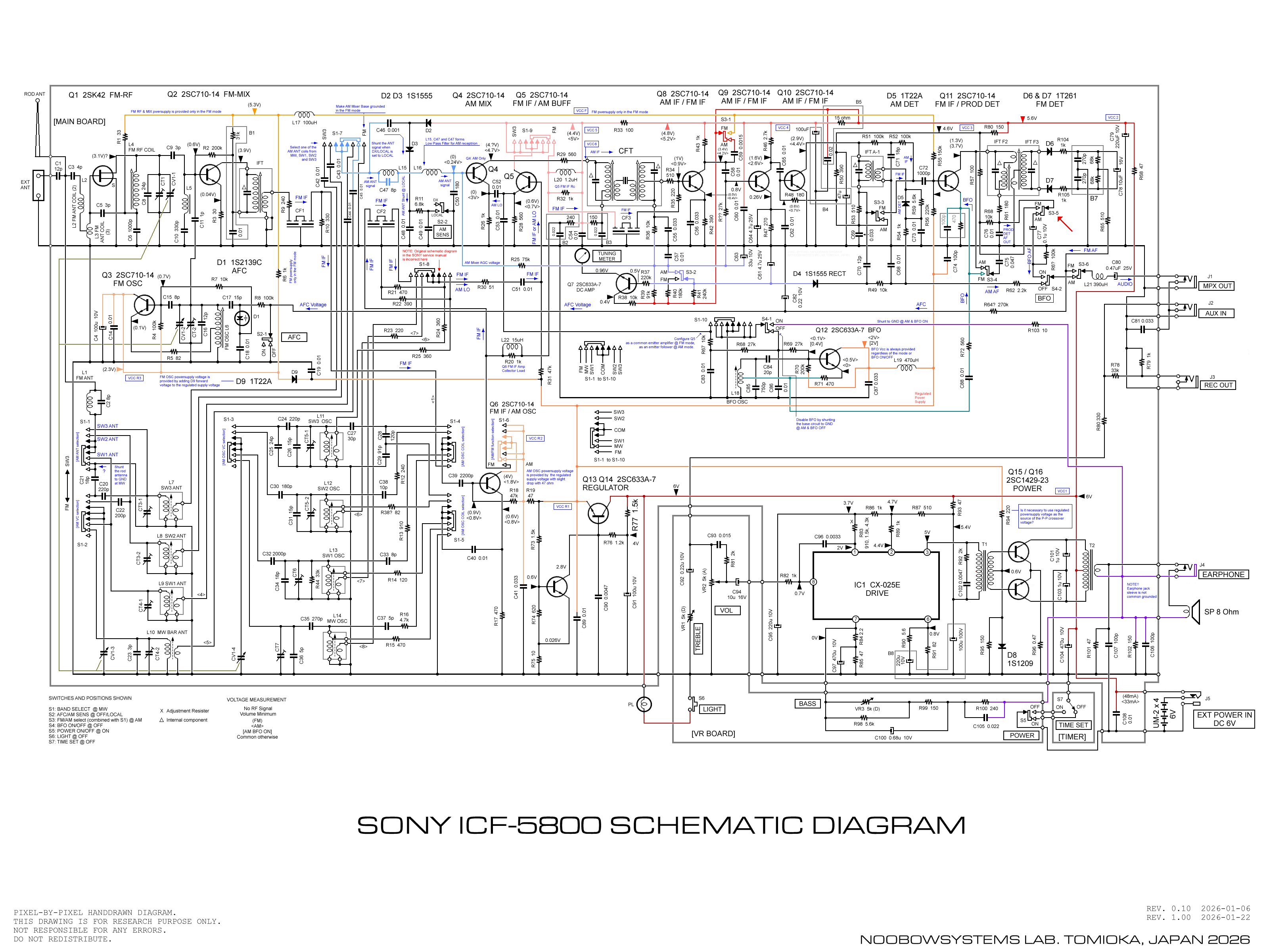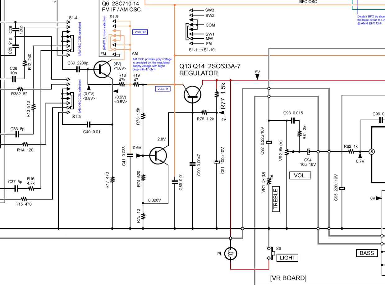 イヤホン端子から信号を取り出していたためなのだろうと思います。   うーん、5800のイヤホン端子の回路、 なんでこんなことしているのでしょう。 なにか意図、あるいは制約条件でもあるんだろうか。   ICF-5900 ではイヤホンジャックのスリーブはすごく普通にグラウンドコモンになっています。 スピーカ+からプリアンプにBASS低域フィードバックする仕組みは同じなのですが、 5900のほうが「普通の」つなぎ方をしているように思えます。   ところでさらに気がついたのですが、 ボリュームコントロールのポテンショメータに入ったC93とR81は、 ひょっとしたらラウドネス効果を持たせているのでしょうか? 5800にはラウドネススイッチはないのでラウドネス回路はないと思っていたのですが。 2026-01-19 |