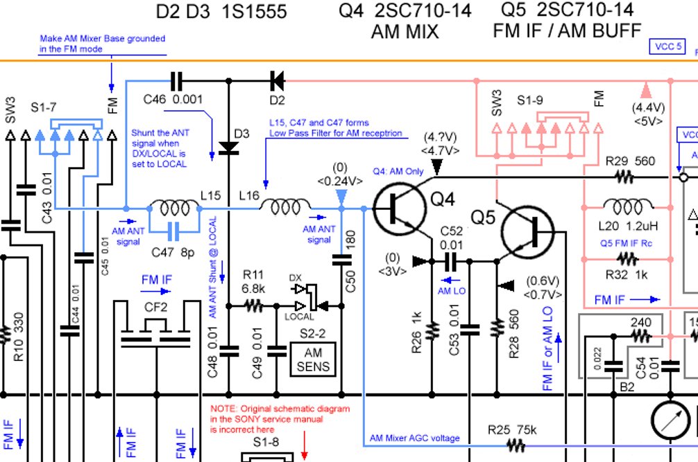 はたしてこれはどういう理屈なのだろう。   回路図を読むと、DX-LOCALスイッチをLOCALポジションにしたときにダイオードD2とD3がオンになり、 アンテナからの信号をC48でシャントする仕組みです。 いわゆるダイオードスイッチ式ですね。   LOCALにすると、ダイオードの順方向電流のぶんAMミキサ段の電源電圧が下がり、 ミキサとバッファのトランジスタのVccがごくわずかに下がって、 局発周波数に影響しているんじゃないでしょうか? |