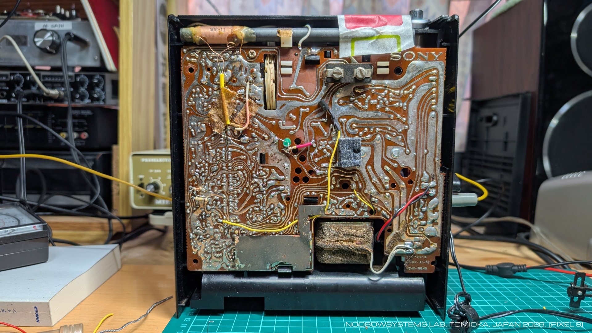 5800本体だけで信号を拾ってしまうため。 5800のメイン基板からロッドアンテナまでの配線を切り離してみましたが、 基板上のパターンの這いまわしだけで妨害波をしっかり受信してしまっています。 ICF-5500ではこの手軽な方法でかなり効果があったのですが、 5800では効果が薄いですね。 基板にパターンカットを入れる程度の工作は必要なようです。 2026-01-15 |