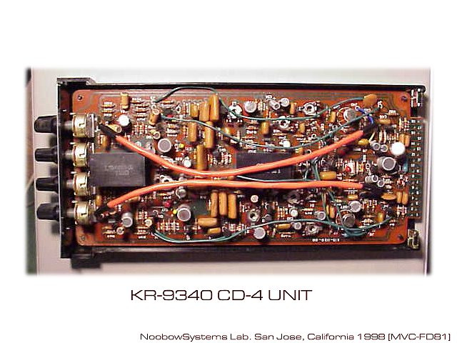 オーディオ装置としての「レシーバ」とは、1つの筐体にFMチューナとアンプを組み込んだ製品をさし、 通常スピーカとレコード・プレーヤを接続してシステムを構成します。 1970年代の初めに、オーディオ界に巻き起こったのが4チャネル旋風です。 ステレオ装置は通常2個のアンプとスピーカで左右別々の音を再生し、臨場感を出しています。 4チャネルは前後左右4つの音を記録・再生することにより、さらに臨場感を高めようというものでした。 当時は4チャネルにあらずんばオーディオにあらず的に、メーカー各社の開発・販売競争が繰り広げられたのです。 スピーカは単に部屋の隅に4つ置けばいい、アンプは4つ並べれば済む。 問題はソースです。 テープデッキはすでに2チャネル往復方式でしたから、ヘッドを換えてやれば4チャネルの録音再生は可能。 でも、4つの音をどうやってレコードで再生するのか? たった1本の針で4チャネルを記録・再生し、なおかつそのレコードは従来の2チャネルプレーヤでも再生できる。 そんな技術がいくつもあらわれ、しかし統一規格ができないうちに、オーディオメーカー各社は新製品を市場に送り出しました。 そんな中のひとつがこのレシーバです。 ファンではあっても、決してオーディオマニアではないわたしがこのレシーバを手に入れたのは、 別にそんなたいそうな理由があるわけではありません。 夕食後に数時間をPCの前で過ごすわたしは、サウンドブラスタのライン入力を切り替えたり、 差し込むだけでスピーカの音が切れるヘッドホンジャックが欲しかっただけでした。 そこで、ポンコツのオーディオアンプを手に入れて、改造してスイッチボックスにしようと考えていました。 ですからある日、フットヒル・カレッジのフレア・マーケットで投げ売りされていたこのレシーバを見たとき、 すぐに買うことにしたのです。