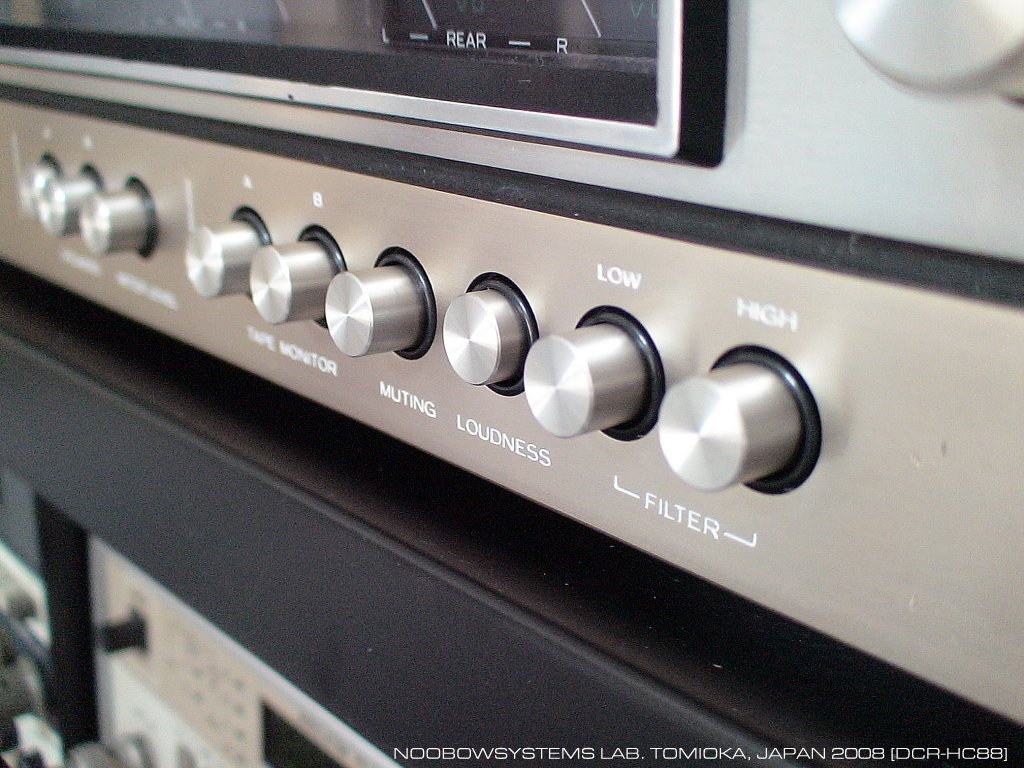 どのスイッチも時折操作してあげないとまた接触不良になってしまうでしょう。 ずらっと並んだプッシュボタンのなかでいまではほとんど必要ないのが、LOWとHIGHのフィルタスイッチ。 HIGHフィルタは傷の増えたレコードのスクラッチノイズを低減するため、 LOWフィルタは反ってしまったレコードを再生するときにレコードの回転周期に同期した超低音を低減するためのものです。 LOWフィルタは何とかなっても、HIGHフィルタを入れると高音域はAMラジオ以上FMラジオ以下程度にまで減衰されてしまい、 とてもHi-Fiとは言えなくなってしまいます。 サンプリング時に音楽情報の一部が必ず失われてしまうCDと違ってアナログレコードにはすべての情報が残されている、 だからいい機材を使えばレコードはCDより必ずいい音がするはずなのだ・・・と、 いまでもアナログレコードの音を追求しておられる方々がいらっしゃいますし、 強烈な慣性モーメントをもつターンテーブルがあったりします。 しかし当時は、こんなフィルタを使いたくなるほど、針先からのスクラッチノイズは悩みの種でした。 4チャネルステレオは、回路技術だけでなく、高度なレコード再生技術も要求しました。 CD-4方式ではリアチャネル情報は30kHzのサブキャリアで変調されています。 よって4チャネルを再生するには、可聴周波数帯を大きく超えて50kHzまで再生可能なレコード針、カートリッジ、 伝送ケーブルそして専用設計されたヘッドアンプが必要でした。 しかし現実には、こんなHIGHフィルタが欲しくなるほどに高音域はスクラッチノイズによる妨害を受けます。 サブキャリアとそれにより変調を受けたリア信号を安定に復調するのは、 理論的には可能であったとしても、 一般家庭用のビニール盤アナログレコードでは至難のことだったのでしょう。 |