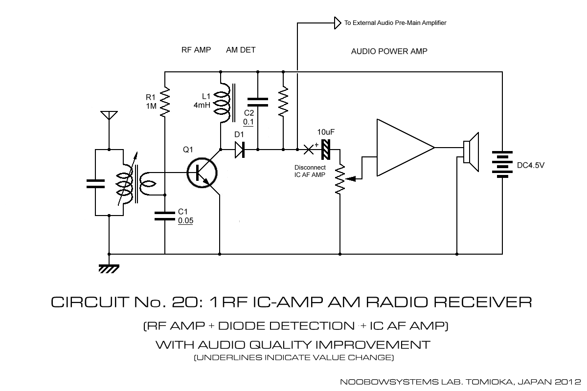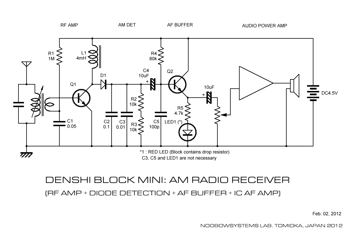 で、つぎに、 電子ブロックmini No. 20 高周波1石 + ICアンプラジオ を組み立ててみました。 同調回路からの信号をトランジスタ1石で高周波増幅し、コレクタからの出力をダイオードで検波し、 その低周波信号を本体内蔵のICアンプで増幅しスピーカを鳴らしています。 送信アンテナから約50km離れた第3研究所では、2mの室内ワイヤーアンテナとアース(室内機器のグラウンドラインに接続) が必要。 NHKをはじめ民放数局が聞こえます。 選択度はこの方式ならまあまあ。AM放送帯上半分では分離はやはり不足です。 感度と分離はこんなものという感じなのですが、音がかなり歪っぽくて悪く、 とても番組を楽しむようなものではありません。 なんでだろう、とても簡単な回路なのに。 ひょっとして本体内蔵アンプあるいは本体内蔵スピーカのせいかと思い、外部音源で本体アンプ・スピーカを鳴らしてみると、 さすがに音量を上げるとスピーカがビビりはじめてしまいますが、今回のラジオの音の悪さを説明できません。 回路図を見てみると、本体内蔵アンプについている音量調整用のポテンショメータ(ボリューム)は10kΩ品が使われているとのこと。 おや、10kΩVRってこの回路にしては小さすぎないかなあ。 電子ブロックminiの本体内蔵アンプにつないでいるブロックを抜いて、 ダイオード検波出力を EL500でつくったトランジスタオーディオプリブースター にいれ、予備増幅した後に 山水AU-7700 のプリアンプと LM386貧乏アンプ でJBL 4305Hを鳴らしてみると、似たような音質。やはり歪っぽいです。 このEL500プリ ブースター アンプには、 Toshiba X01T をつないだときに ジャックセンシング が効くように入力に10kΩシャントを入れてありましたが、 これを取り外してみると・・・おおおっ!! 音ががぜん大きくなり、さらに歪が大幅に減った!! パーフェクトというには歪も残っているしノイズも多いけれど、これならゆっくり番組を楽しめる。 やはり、本体内蔵アンプのボリュームの10kΩがダイオード検波回路にとっては重すぎる負荷だったのです。 ひずみは減りましたが受信音は低音がまだ細く、またノイズも多いです。 同調コイル2次側の直流阻止キャパシタを0.1μFブロックから0.05μFブロックに変え、 ダイオード検波出力の平滑キャパシタを0.01μFブロックから0.1μFブロックに置き換えたら、 ノイズがぐっと減り、低域が豊かな音質になりました。 これならリラックスしてずっと聴いていられる。 電子ブロックminiで受信していることを忘れてしまいそう。 このラジオの性能がよくないのはもうひとつ、 スピーカから出る音声信号波形に合わせて高周波増幅トランジスタの電源電圧が変動し、 それがそのまま検波出力信号に影響してしまうのです。 結果として、アンプのボリュームを上げるなどして大きな音が出ると、 フィードバックが発生してしまい、ひどいとモーターポーティングや異常発振を引き起こしてしまうのです。 これは電源ラインのデカップリングが不足していると言われる状態です。 対策としては、高周波トランジスタへの電源ラインに抵抗と大き目のキャパシタを入れてあげればOK。 簡単なことですが、ブロック式配線では思いついた回路にブロックを並べるのは、 できたとしてもとても大変です。 2012-01-30 Circuit No.20 1RF + IC AM Radio Receiver |
