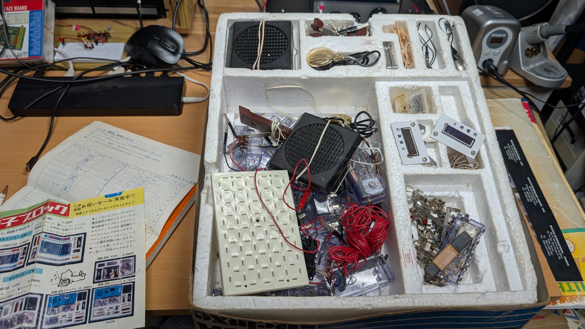 さらにその前が今回手に入れた電子ブロック 「電子ボード」SRシリーズだったんですね。 今回手に入れたパッケージにはSR3A Deluxeと書かれています。 定価8700円。 もし当時の自分がマイキットではなくて電子ブロックを欲しがったとしても、 とても買ってもらえるものではなかったでしょうね。 |