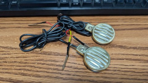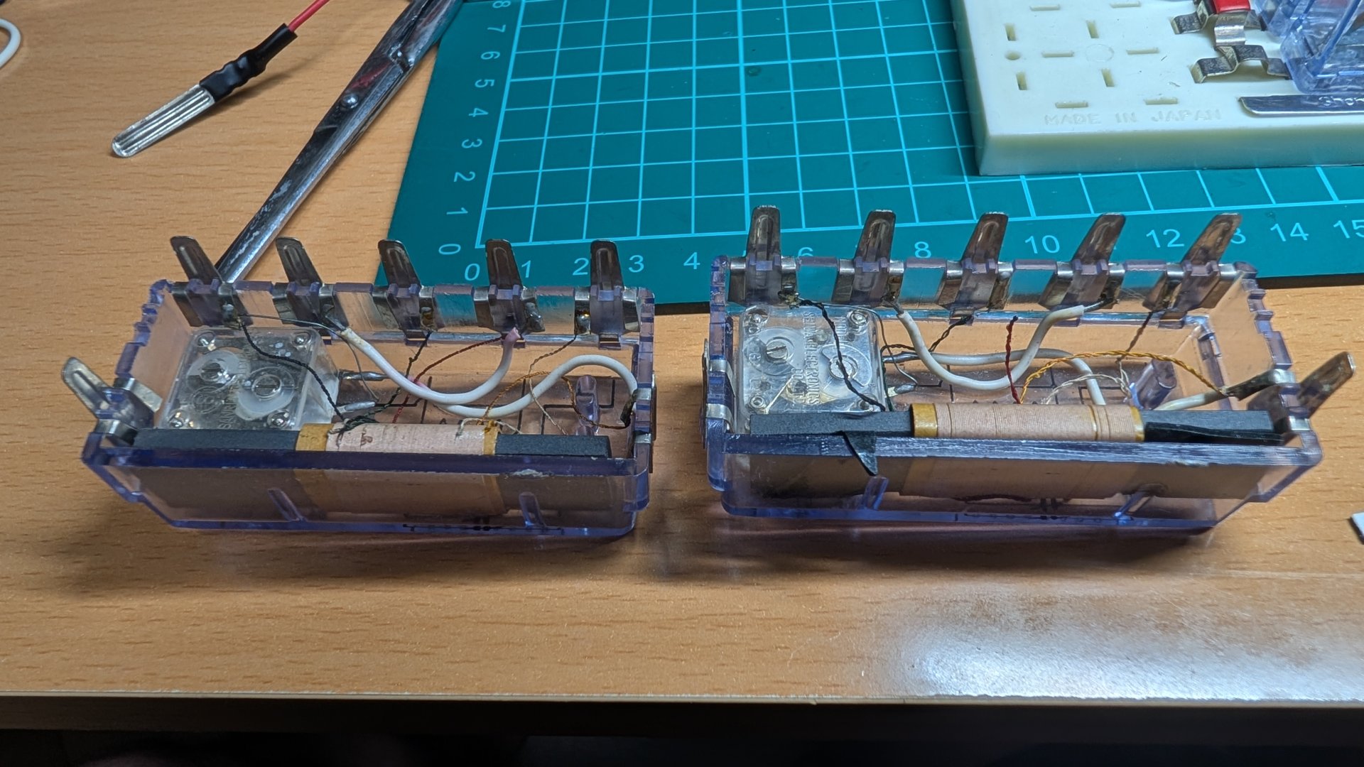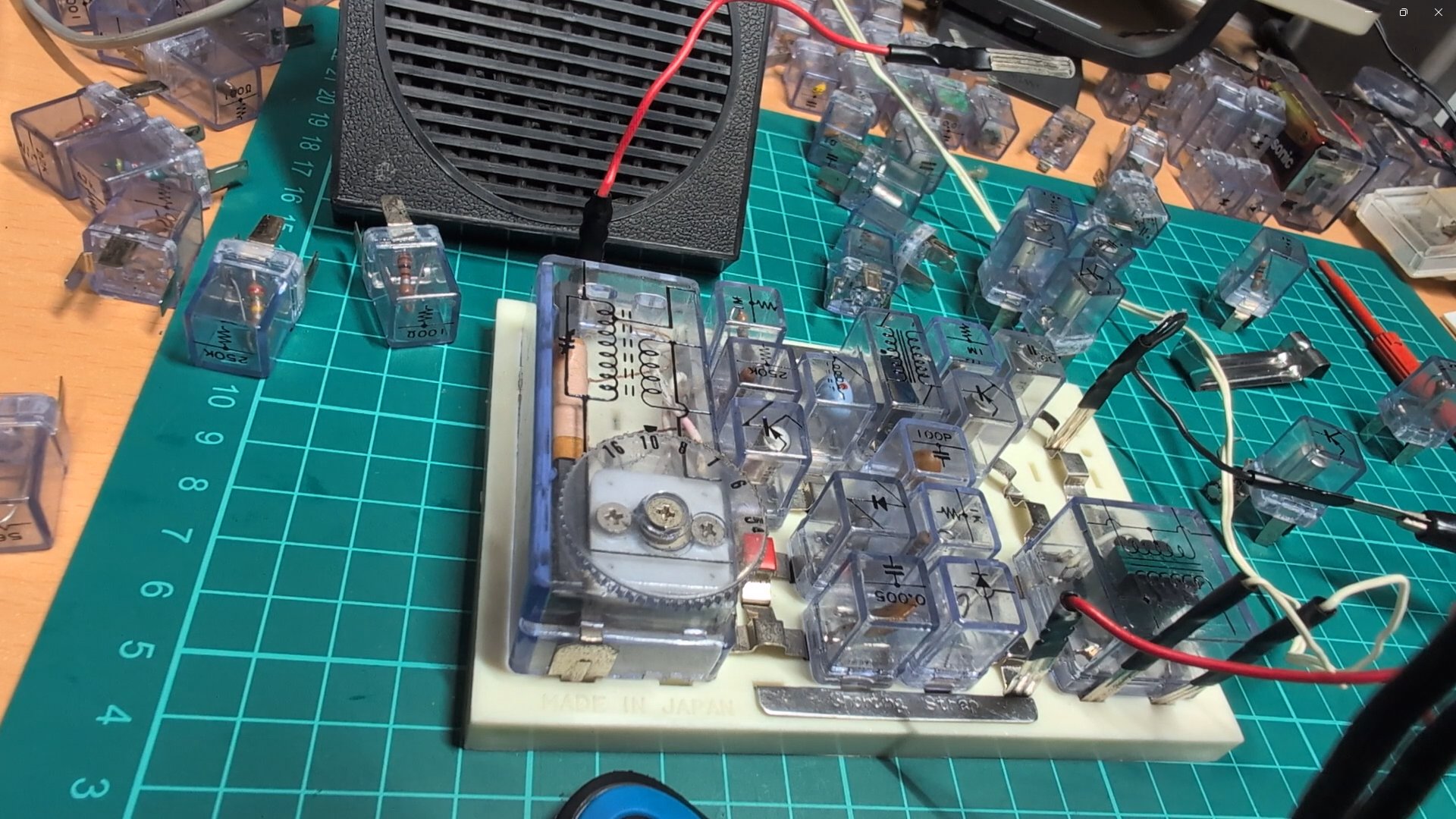 当時物のクリスタルイヤホンはロッシェル塩が風化してダメになってしまうものだと聞いていましたから。 太陽電池は2個とも、室内の明るさで0.5V以上を出しています。 スピーカもOK。 |