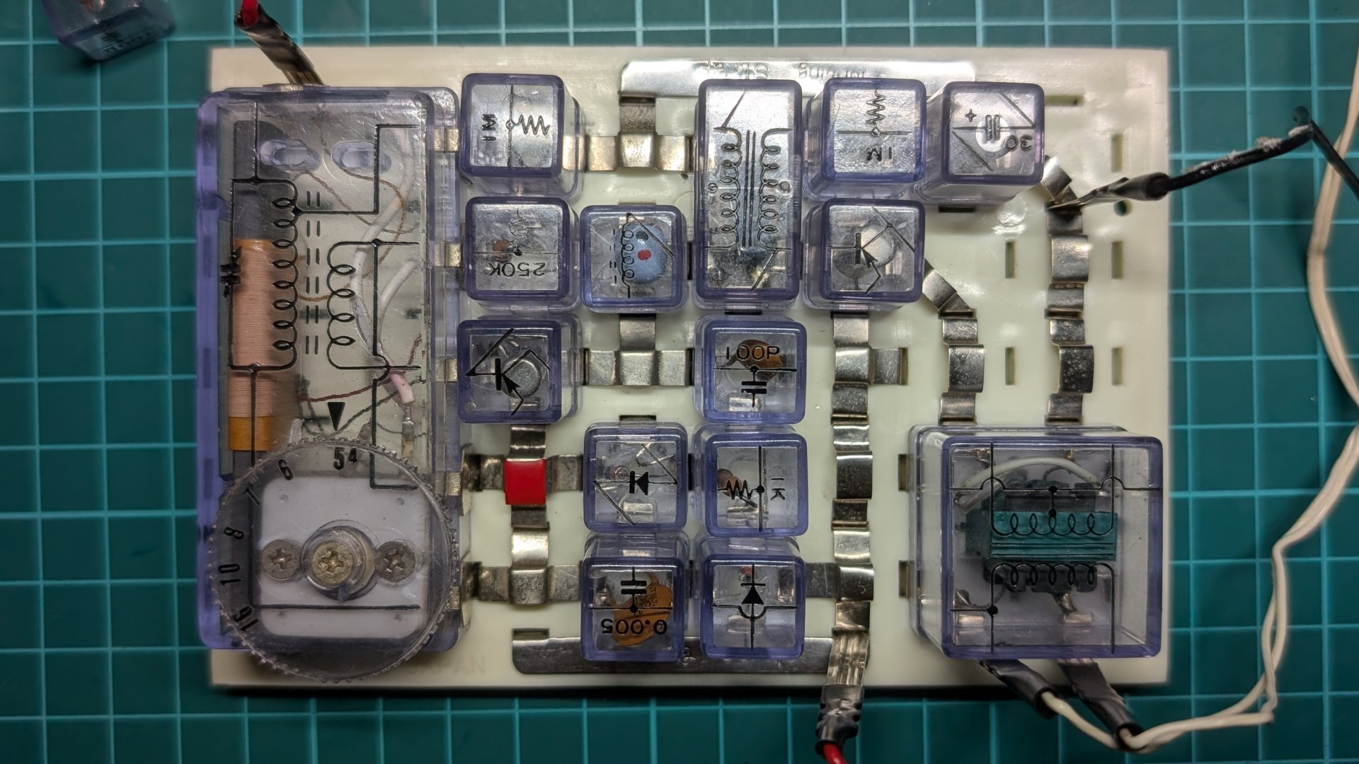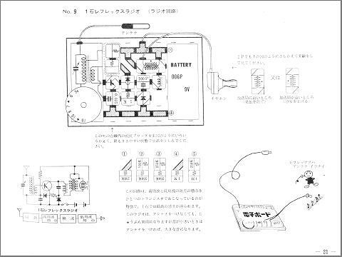 スピーカが付属していないSR2Aで試せるものになっています。 マイキット80には高周波チョークコイルはなく、 レフレックス回路はつくれませんでした。 ゲルマニウムダイオードも1本しかなかったので倍電圧検波もできず。 レフレックスが作れる、という点で電子ブロックの勝ちですね。 うまくブロックをレイアウトできればマイキットよりも配線長が短くなり、 ラジオの動作も安定します。 |