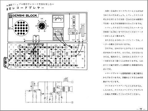 プッシュプルが使えれば付属のスピーカが負けるほどのパワーが出せます。 プッシュプルアンプを作ろうとするとドライバ含めトランジスタは3石必要。 けれどもSR3Aではトランジスタは3つしか付属していないため、 プリアンプ用のトランジスタがありません。 だからプッシュプル式のレコードプレーヤアンプを作るのは無理。 プッシュプルB級を使う実験は、 ドライバトランジスタを発振させてブザーにするといった使い方のものがいくつかあるだけ。 トランジスタが4つあるSR4Aなら、 プッシュプル式のレコードプレーヤアンプが作れます。 右図がそれ。 マニュアルでは説明されていないものの、 初段のプリアンプにはしっかりRIAAイコライザが入っています。 SR4Aでは1石レフレックス+1石ドライバ+2石プッシュプル構成の4石レフレックスラジオが作れます。 微弱電界地域でも大きな音で番組を楽しめたでしょう。 |