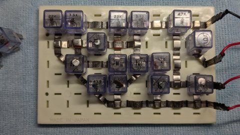 しばらくあちこちチェックしたりブロックをグネグネゆすってみたり。 ブロックのターミナルピン表面にはサビはなくかなりいい状態を保っていますが、 それでも接触不良は出ているようで、 ブロックのピンを接点ブライトで処理したり磨いてみたり。 じきにラジオが鳴りはじめました。 さすがレフレックス! 微弱電界地域の富岡ですが、 アンテナ線をつながずによく聞こえます。 マニュアルにはトランジスタのベース抵抗を4通りに変える方法が記載されています。 本機とラボの環境ではベース抵抗を低くすると発振気味になりましたので、 ベース抵抗は1MΩ+250kΩに設定しました。 |