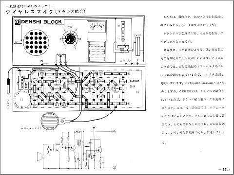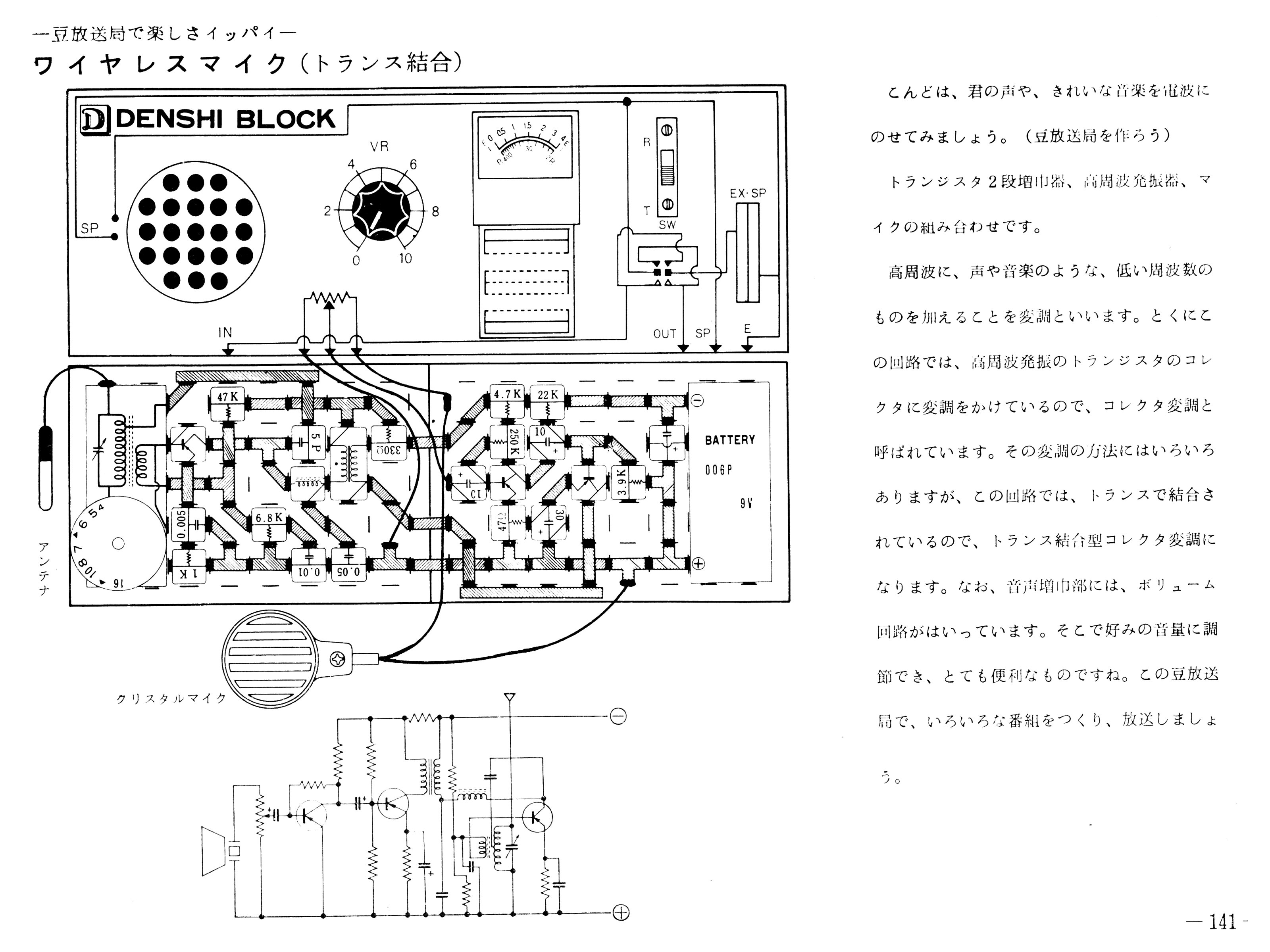 バリエーションを加えて合計9例紹介されています。 今回試すこの回路はクリスタルマイクの音声信号をトランジスタで2段増幅し、 発振・変調トランジスタのコレクタに入ったトランスに入れて変調をかけています。 |