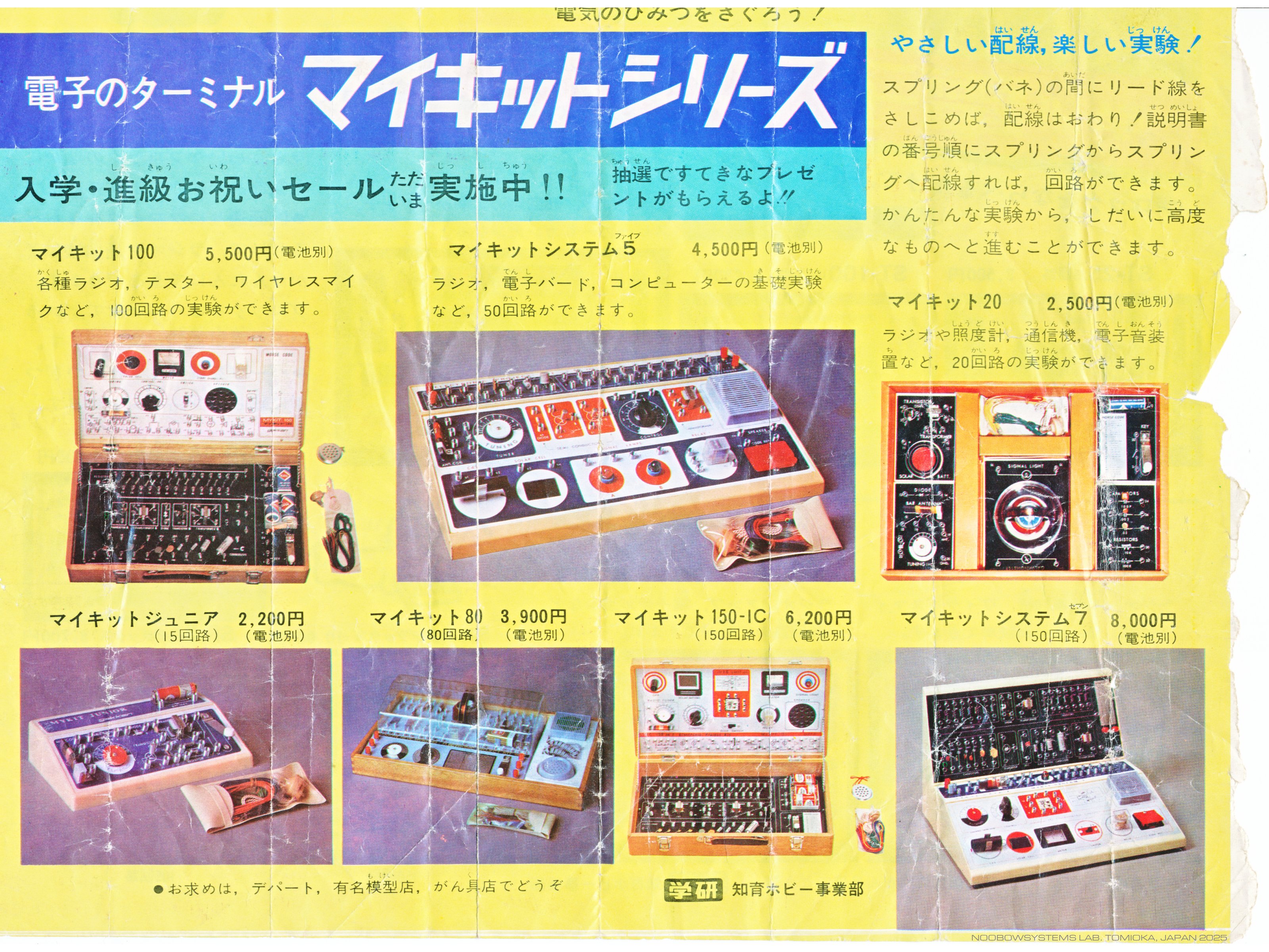 おそらく雑誌から切り離したものと思われる学研マイキットと電子ブロックの広告が入っていました。 Lafayette 80-in-One のページに書きましたが、 町のおもちゃ屋さんで買ってもらえた当時の私の愛機はマイキット80でした。 価格は3900円。 マイキット100はおねだりできる額を越えた高嶺の花でした。 当時電子ブロックという製品があるのは知っていましたが、 配線の自由度がなさそうだなと思い、最初から電子ブロックには目をくれずに、 マイキットをおねだりしたのでした。 |