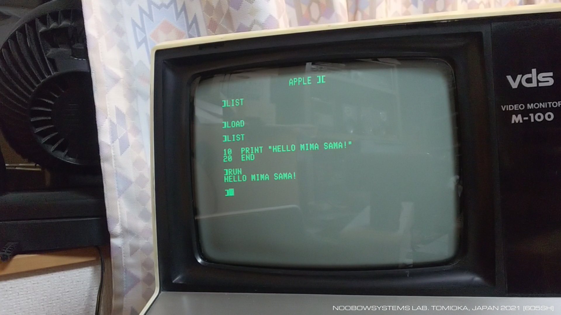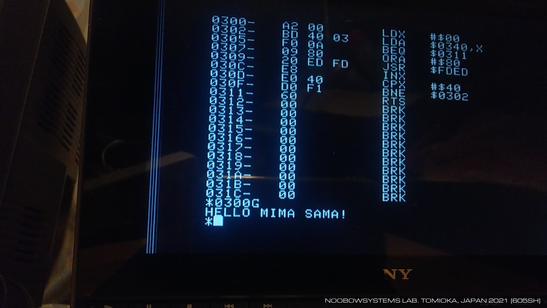 ビデオターミナルディスプレイを見ながらキーボードで十六進入力できるというのは、10倍どころではない生産性の向上です。 Apple IIのモニタは、カセットテープへのセーブとロードもできます。 昔と違ってデジタル録音なので録音ミスや記録の不安定さが全くないのは本当に幸せなこと。 それに何より、モニタに内蔵された逆アセンブル機能がなにより頼もしい! 軽くてストロークの深いApple IIのキーボードをスコンスコンと打ち、 レスポンスの良いモニタプログラムを使ってのプログラム入力は、 原始的だし、生産性はとても低いものですが、 操作していて実に気持ちよく、そして楽しい!! ああだこうだ独り言をつぶやきながらデバッグを続け、 シンプルな "HELLO MIMA SAMA!" プログラムの完成。 2021-01-29 初6502マシン語プログラム完成 次いでTime IIの日付時刻表示プログラムのマシン語版を作成しました。 1回の実行時間は16.91msでした。 Applesoft BASIC版の20倍 高速ということになります。 さすがマシン語は速い!! 2021-01-30 Time II表示プログラム マシン語版 完成 |