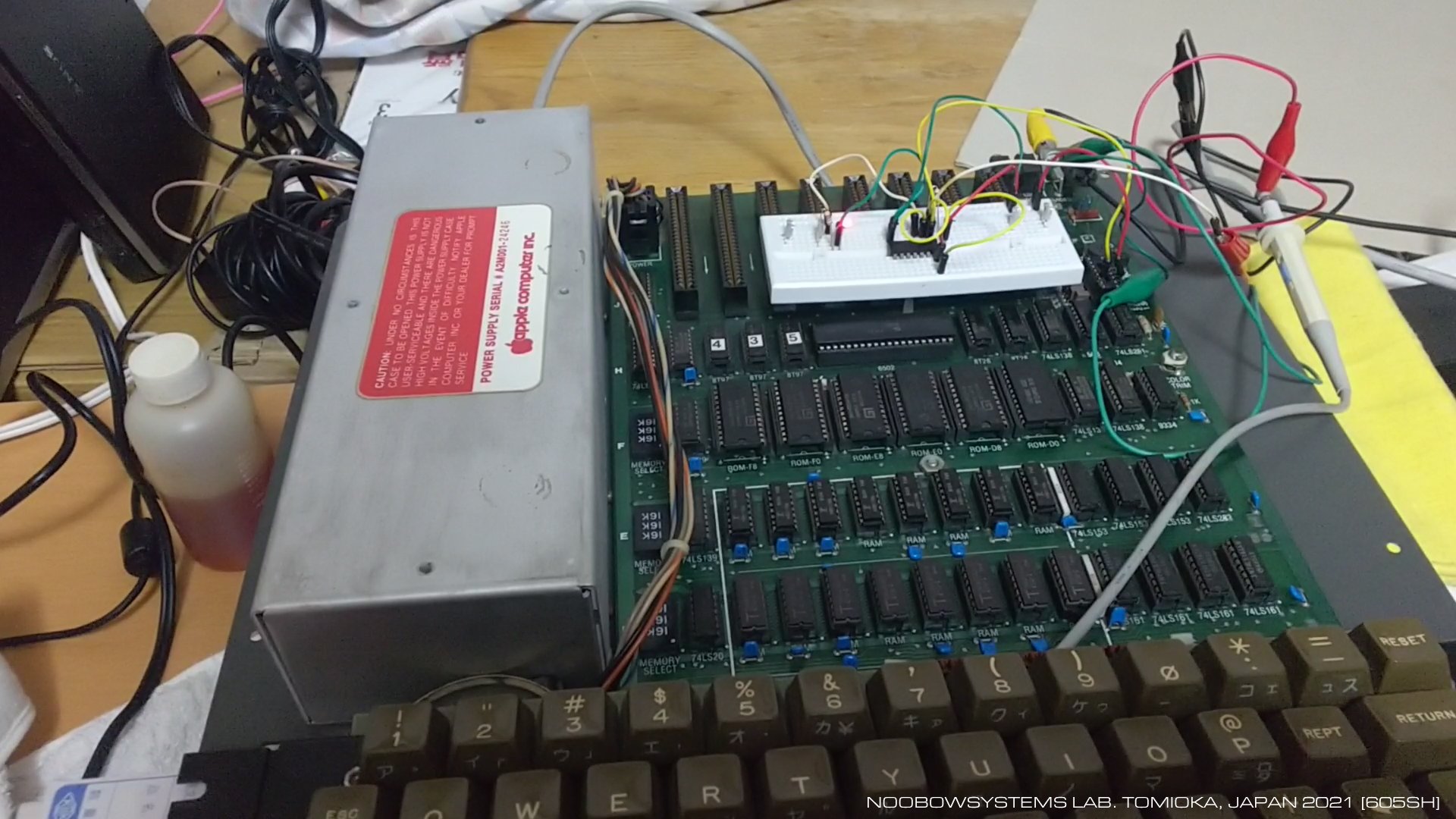 いまなら分かるぞ! で、どうしてG1イネーブルがHIにならないのだろう。 AD14とAD15からLS138のG1イネーブルをつくるANDゲート H1 74LS08のピンを見てみると、 ANDゲートの2本の入力ピンがどちらもHIなのに、出力はLOのままだ! これじゃあROMがアクセスされないのも当然だ! でも先週、LS257の代替回路を作ろうと思ったのにANDゲートロジックIC 74LS08はラボに在庫は一個もなくて… だからLS257を発注する時に一緒に新品を5個買っておいたんだよ! すごいぞワイ! 74LS08を新品に刺しかえると・・・ APPLE ][ のロゴとBASICのプロンプトが出た!! 2021-01-21 ROMアクセス不能 - H1 74LS08新品交換で回復 |