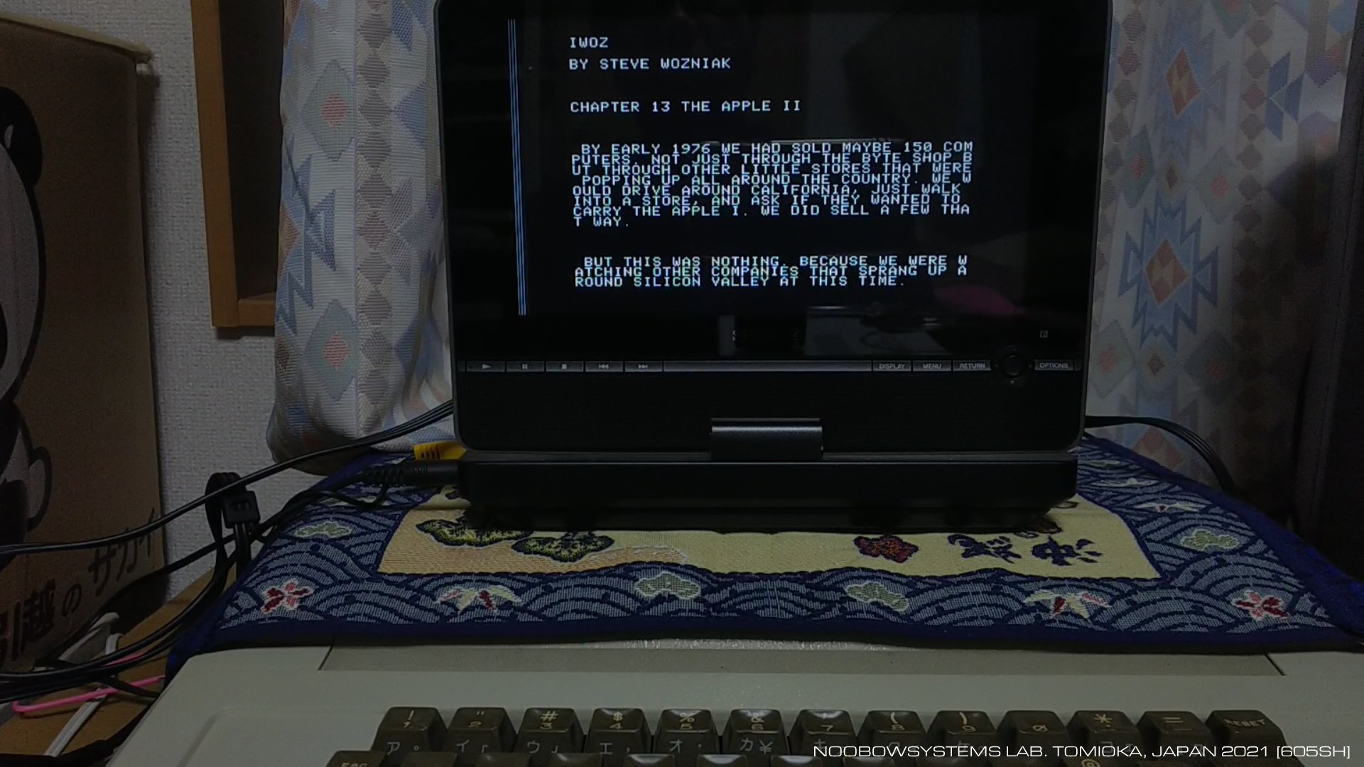 データバッファのデータをテキスト表示するプログラムを書いて、できたできた。 読み込ませるテキストは、Steve Wozniac著 "iWoz" から、Capter 13 "The Apple II" を。 そう、君はこうして生まれたんだよ、アップルII。 データ転送用バッファとしてシステム起動時に8キロバイトを確保していますが、 8キロバイトに収められるのは同書Chapter 13の3分の1にも届きません。 2021-02-07 Windows 10からテキストファイルをApple IIに転送して画面に表示することに成功 |