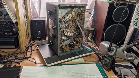 最後に電源を入れたからはや23年が経過しています。 永い眠りから目を覚ましたEC-1Bがさいしょに受信したのはJOAK NHK東京第一、 第2回目の緊急事態を宣言する総理のスピーチが流れてきました。 いつまで続くんでしょう、 そしてこの先どうなってしまうんでしょうか。 1998年にすでに出ていたチューニング時のスクラッチノイズは、 バリコンシャフトに接点洗浄スプレーを吹いてほぼ消えました。 あわせボリュームワイパーにも接点洗浄スプレーを吹いて、 EC-1Bはほぼ完調になりました。 チューニングのバックラッシュはなく、 バンドスプレッドもスムース。 選択度も良好。 新型ペンタグリッドコンバータ12SA7を使ったスーパーヘテロダインはドリフトがほとんどなく、 ゆっくり短波を楽しめます。 どうやらこのラジオは、 すくなくとも今の状態ならほぼ整備不要と見えます。 ふたたび段ボール箱にもどし、 点検作業は完了。 2021-01-07 動作チェック |