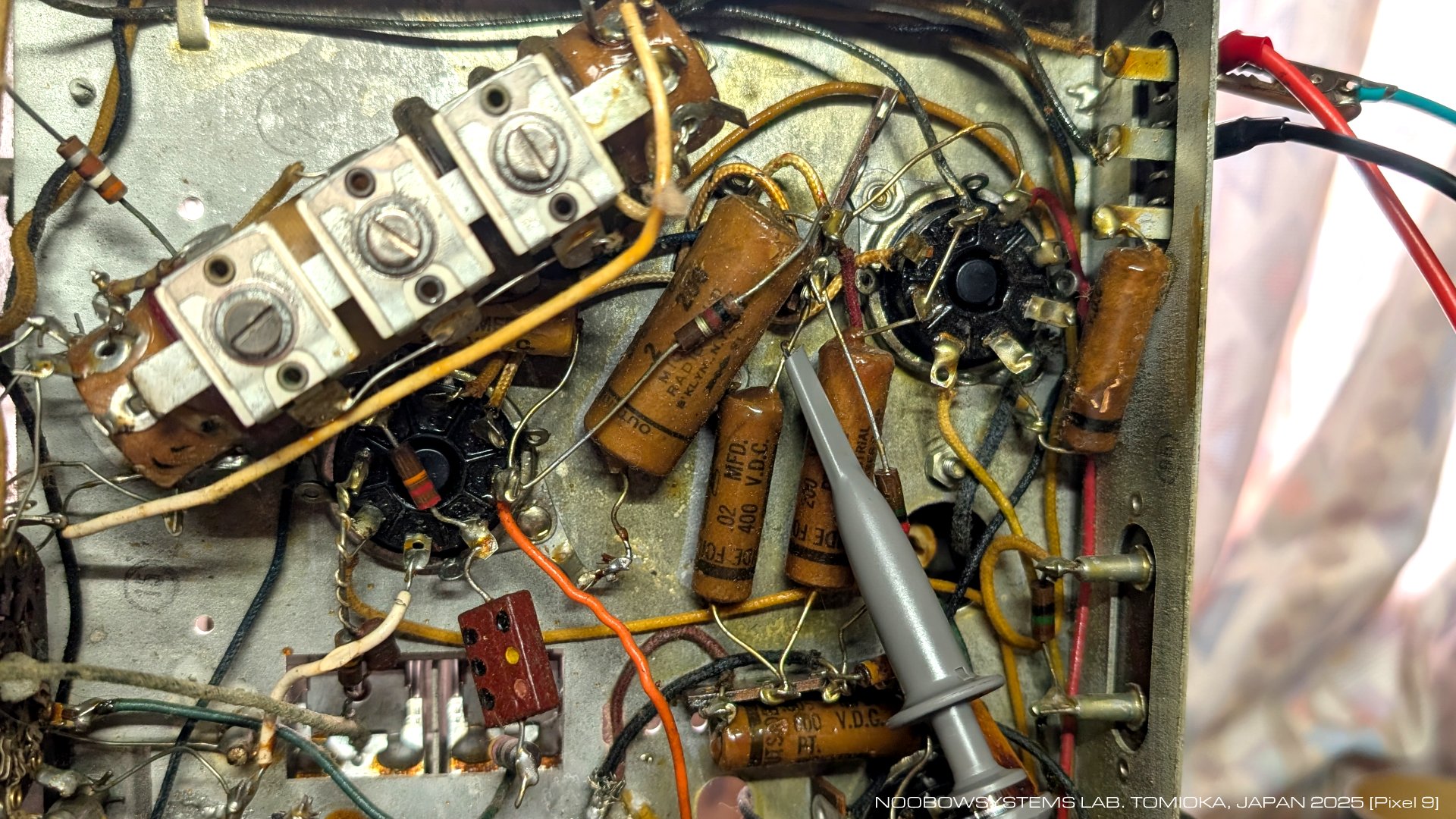 条件によってはけっこう効果があることを体感しました。 今回の作業を開始してから、朝8時から深夜0時までの連続16時間動作を6日以上行ったのに、 コンポーネント劣化の兆候はとうとう発生しませんでした。 なのでこれで今回のEC-1Bの作業は完了にします。 当時物のワックスペーパーキャパシタで元気に鳴っているこのEC-1B、 ひょっとするとかなり稀少な部類に入るのかもしれませんね。 |