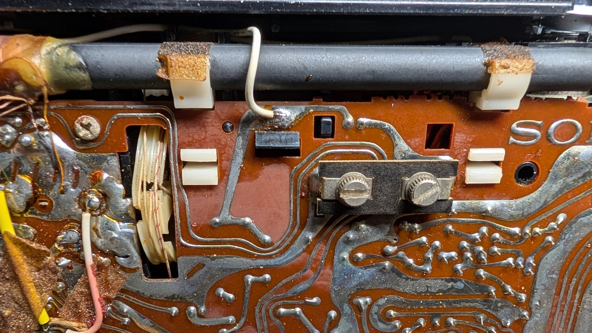 ダイヤルは重く、かつダイヤル位置によって重くなったり軽くなったりします。 このままではすでにラボでメンテナンスを受けた同世代のモデル、 パナソニックRF-1150 に太刀打ちできません。 回路図等の技術資料がないので再調整などは保留するにしても、 ダイヤルの動きと音割れはなんとか修理しなくてはなりません。 情けないライバルの姿は見たくないものです。 |