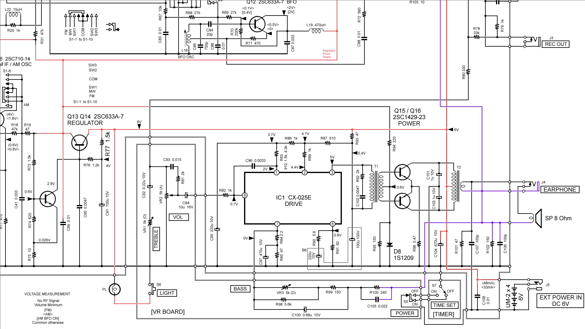 メイン基板のパターンを追い、AMミキサと局発バッファトランジスタの電源をデジボルで測定できるようにし、