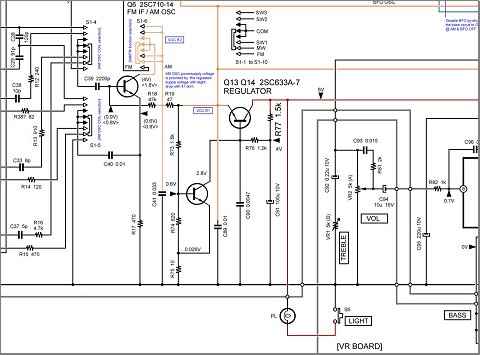 そんなことを考えながら、キャビネットを開けます。 この時代のトランジスタラジオはたいていそうですが、 AM受信回路とFM受信回路がなるべく共通に使えるように工夫されています。 一つの部品をAMでもFMでも使うことによって部品点数を減らし、 コストを下げ、回路基板を小型・軽量化し、消費電力も減らす。 コンシューマ向けポータブルラジオに求められる技術なわけですし、 回路図を読むとその工夫と努力に感銘します。 いっぽうでAMとFMの回路機能の双方を同時に最適化するのはやはり困難です。 多少のコスト増も許され、装置の小型軽量化や消費電力の制約がないならばAM用とFM用とで回路を独立にし、 それぞれに最適な設計が楽になり、よって確実な回路になります。 しかしポータブルラジオは商品意図ゆえの設計制約を宿命として持たされているわけですね。 最大限の努力が払われた回路は、受信機の性能としては必ずしもベストなものにはなっていないのが普通でしょう。 |