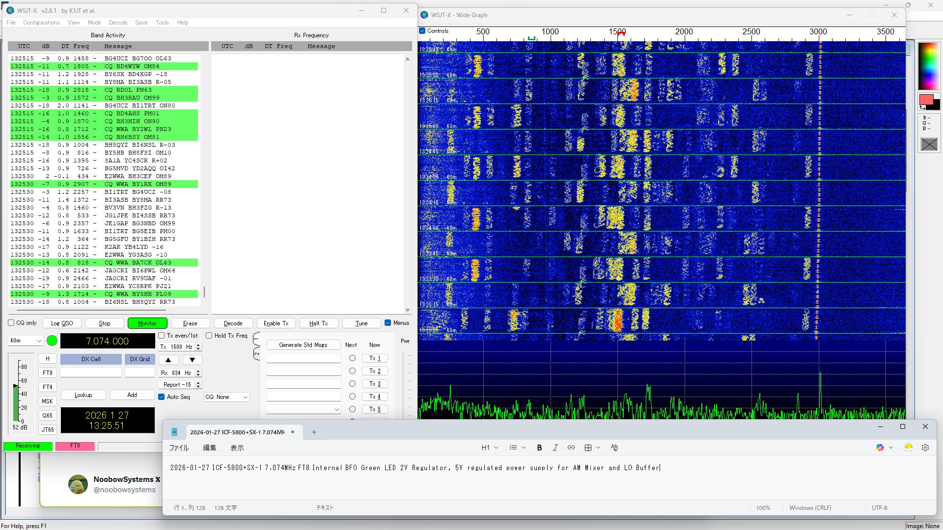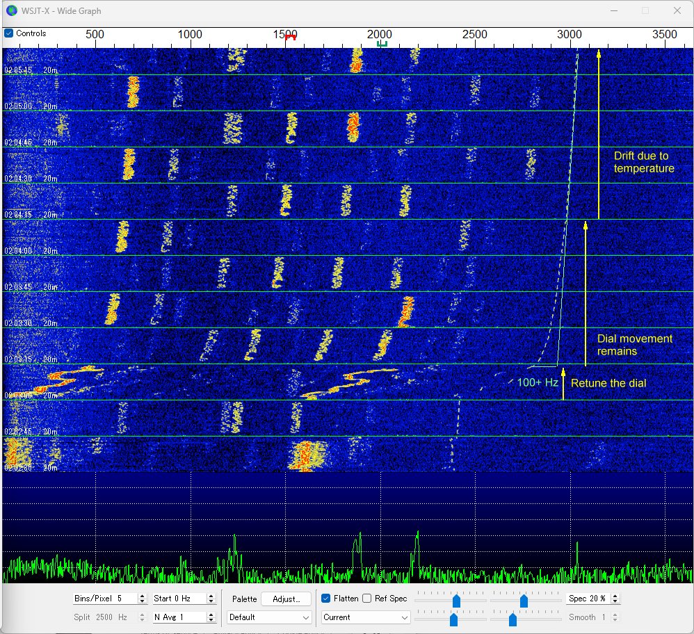 7MHzのFT8の受信中、7.077MHzで注入しているテスト用パイロット信号のスペクトログラムがすっきり直線になっています。 ICF-5800のAMミキサとAM局発バッファの電源は、 6V非安定Vcc系の最下流からとられています。 信号強度が変化するとAGCのかかり具合が変わり、 中間周波段の消費電力は大きく変わります。 その影響でミキサとバッファの電源電圧も変動し、 その影響でバッファトランジスタのベース接合容量が変化して局発周波数の変動を招いている・・・ と解釈するのが正解なようです。 2026-01-27 AMミキサと局発バッファを安定化電源で駆動: 信号強度に呼応した周波数変動は大幅改善 |