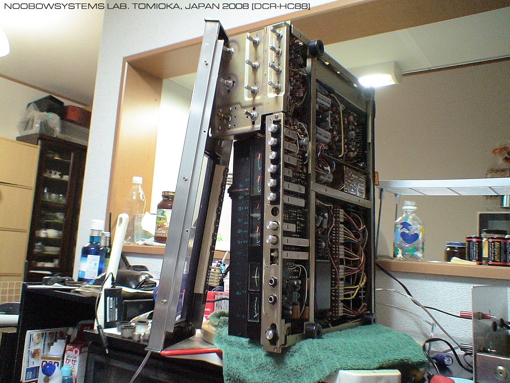 さらに片づける時間もないまま。 転居後3ヶ月の間スピーカもアンプも設置できないままでいたNoobow9100コンピュータですが、 LM386N-3を使ったミニミニアンプ を用意してやっと音楽を楽しめるようになりました。 しかし最大出力700mWのポータブル機器用パワーアンプICではさすがに音量を上げての再生は困難。 そこで第2研究所から引き揚げてきたKR-9340の修理を始めることにしました。 最初の修理が完了してからすでに12年、 最後に使用を停止してからでさえ7年経っています。 ホントに早いなあ。 KR-9340はまるきり機嫌が悪くて、まともに動作しませんでした。 いろいろいじるうちに音が出始めましたが、 スピーカ切り替えスイッチの接触不良はしつこくON-OFFを繰り返してもなかなか改善せず。 フロントパネルを取り外してスイッチ内部に届くことを祈りながらSafeWashを噴射したら、 じきに回復しました。 |